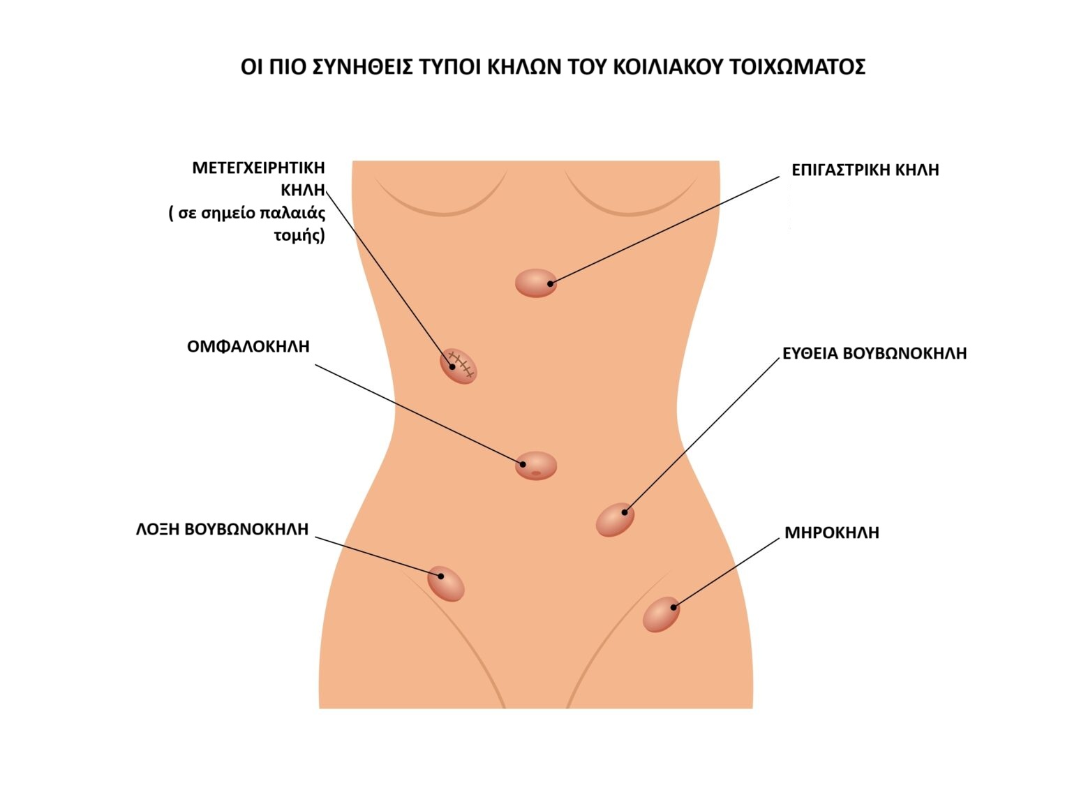 Ανάλογα με την ανατομική περιοχή, οι πιο συνηθισμένες κήλες που αντιμετωπίζουμε είναι: